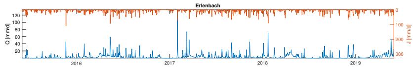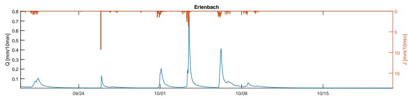 Figure 6: Erlenbach catchment: High-frequency measurements of stream discharge [mm/10 minutes], and precipitation [mm/10 minutes], as well as