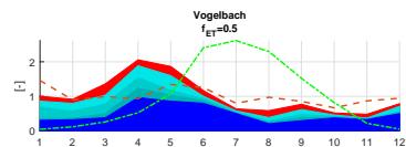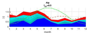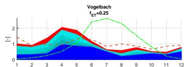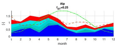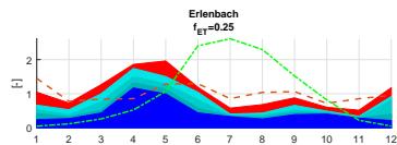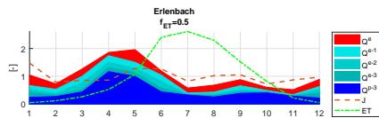 A sensitivity analysis regarding the evapotranspiration rates ET from ERA5 confirms the calculated seasonal variations of the Pardé coefficients both for the Alp catchment and its tributaries, Erlenbach and Vogelbach. The analysis, shown in Figure 12, indicates a shift in proportions towards