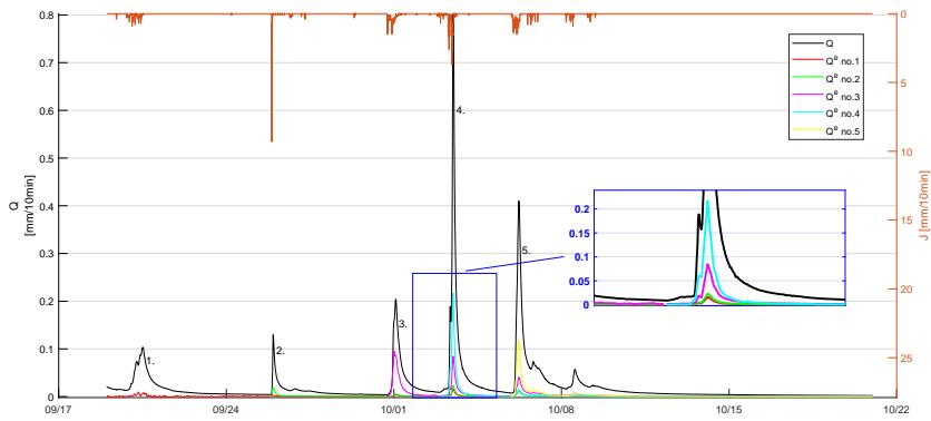 Figure 7 shows the separated event water response according to equation (22) and Figure 1 for five rainfall runoff events between September 19, 2017 and October 21, 2017. The volume-weighted version of this time-varying response can be considered an approximation of the time-varying backward travel time distribution, as shown in equation (23). In addition, the so-called rapid mobilization of pre-event water can be detected. For instance, in the magnified section of event no. 4, event water from the previous events 1-3 still occur at the catchment outlet. Von Freyberg et al. (2018) reported that pre-event water is more efficiently mobilized under wetter conditions, showing that the rapid activation of the pre-event water at Erlenbach (even during small storms) can be explained by generally shallow perched groundwater tables in the aquifer overlying the low permeability bedrock.