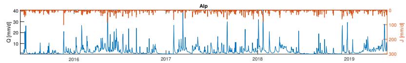 Figure 3: Alp catchment: Four years time series (June 2015-May 2019) of daily stream discharge