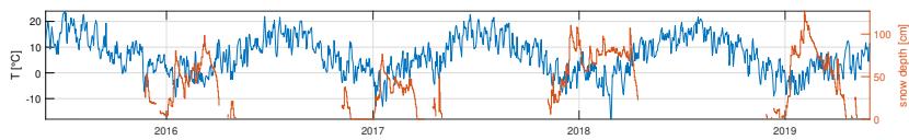 Figure 4: Erlenbach catchment: Four years time series (June 2015-May 2019) of daily stream discharge [mm/d] and precipitation [mm/d], temperature