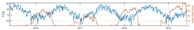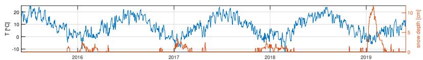 $[\mathrm{mm / d}]$ and precipitation [mm/d], temperature $[^\circ \mathrm{C}]$, and snow depth [cm], as well as $\delta^{18}\mathrm{O}$ composition in discharge and precipitation $[\% ]$ (Von Freyberg et al. (2022)). Tracer concentrations in precipitation are area weighted according to the hypersometric curve. The snow depths are retrieved from ERA5 as part of the Copernicus Climate Change Services (Hersbach et al. (2019)