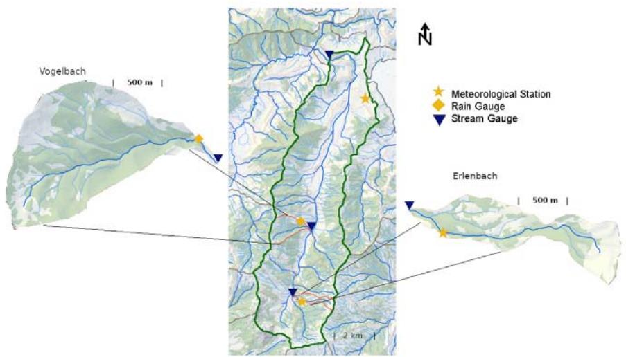 In the following, an analysis of the runoff generation processes in terms of event $Q^{e}$, recent $Q^{r-3}$, and pre-recent $Q^{p-3}$ runoff components is demonstrated for the pre-Alpine Alp catchment (46.4 km2) and two smaller tributaries (Erlenbach, 0.7 km2, and Vogelbach, 1.6 km2), whereas recent water is understood as the contribution of the respective three prior rainfall-runoff events, that is
