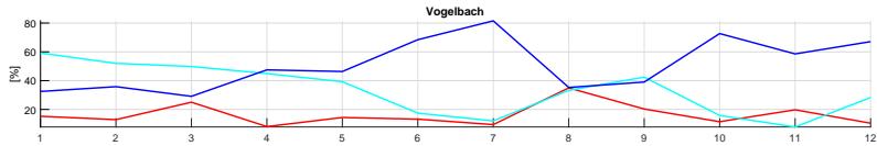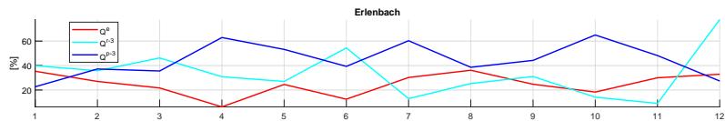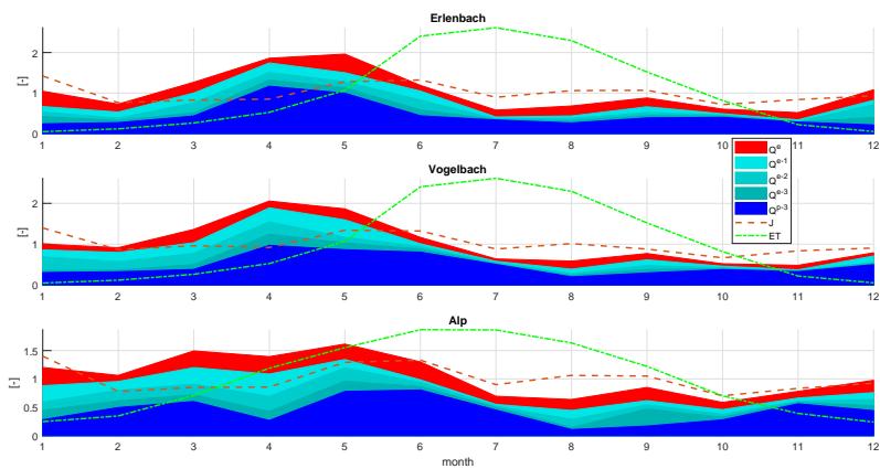 $Q^{\mathrm{e}}$, recent water $Q^{\mathrm{r} - 3} = Q^{\mathrm{e} - 1} + Q^{\mathrm{e} - 2} + Q^{\mathrm{e} - 3}$, and pre-recent water $Q^{\mathrm{p} - 3}$ for the Erlenbach, Vogelbach, and Alp catchments in relation to the monthly Pardé coefficients of stream discharge (Q). Monthly Pardé coefficients (1: January - 12: December) of precipitation (J), and evapotranspiration (ET), based on the four-year investigation between June 2015 and May 2019, and an iterative extension of the standard two-component hydrograph separation method. Evapotranspiration data are taken from the reanalysis product ERA5 be shown in Figure 9. In relation to the stream discharge Q, the event water component $Q^{e}$ has its maximum $(>32\%)$ during August in general, as shown in Figure 10 and Figure 11. The highest recent water fractions $Q^{r-3}$ $(50 - 59\%)$ can be expected at the beginning of winter (December, January), whereas the lowest fractions $(7 - 14\%)$ are found at the end of autumn (November). In return, higher pre-recent water fractions $Q^{p-3}$ can be found in the summer (July, $60 - 82\%$ ) and in the middle of autumn (October, $64 - 74\%$ ). The two tributaries expose an additional peak of pre-recent water in the snowmelt season (April, $47 - 62\%$ ), during which the lowest event water fractions $(6 - 8\%)$ can be expected. For the Alp catchment, the event water component $(29 - 32\%)$ and recent water component $(56\%)$ clearly exceed the pre-recent component $(17 - 21\%)$ in August and September after the month July, which is characterized by relatively low precipitation, high evapotranspiration, and low soil moisture.