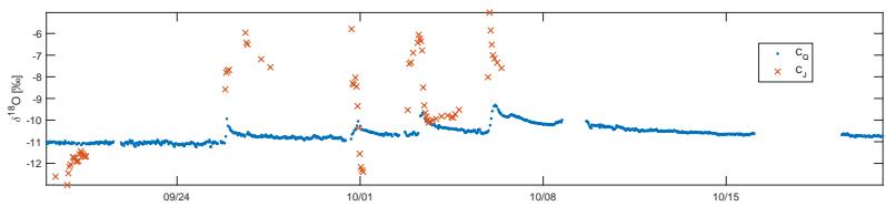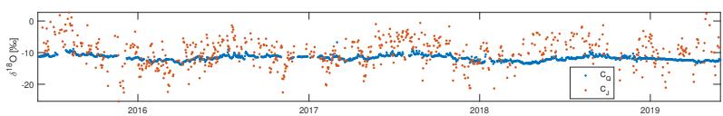 $\delta^{18}\mathrm{O}$ composition in discharge and precipitation $[\% ]$ between September 19, 2017 and October 21, 2017 (Von Freyberg et al. (2018)) streamwater sampling, sample handling and isotope analysis. Streamwater isotopes were measured in the Alp main stream and in two of its tributaries (Erlenbach and Vogelbach). Precipitation isotopes were measured at two grassland locations in the Alp catchment: in the headwaters at $1228\mathrm{m}$ a.s.l. and near the outlet at $910\mathrm{m}$ a.s.l. The data set also includes the daily time series of key hydrologic and meteorologic variables, such as daily streamwater and precipitation fluxes, air temperature, relative humidity, and snow depth.