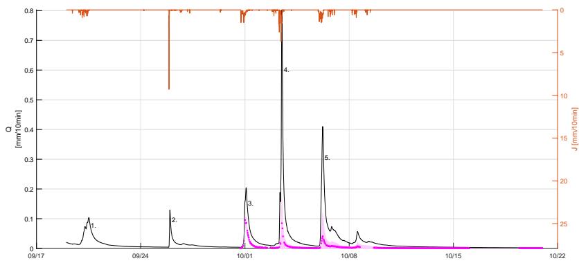 Figure 7: Erlenbach Catchment: Precipitation [mm/10 minutes], Stream Discharge [mm/10 minutes], and Separated Event Water Response [mm/10 minutes] for Five Rainfall Runoff Events Between September 19, 2017 – October 21,