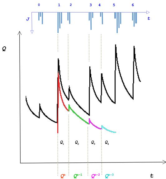 This is the volume flow of the water that entered the catchment at interval $[t_1, t_2[$ with rainfall $J_1$, which appears in the stream discharge $Q$ during interval $[t_1, t_{1 + \tau + 1}[$, here as a result of the rainfall events $J_1, J_2, \ldots, J_{\tau + 1}$ and the related catchment responses $Q_1, Q_2, \ldots, Q_{\tau + 1}$.