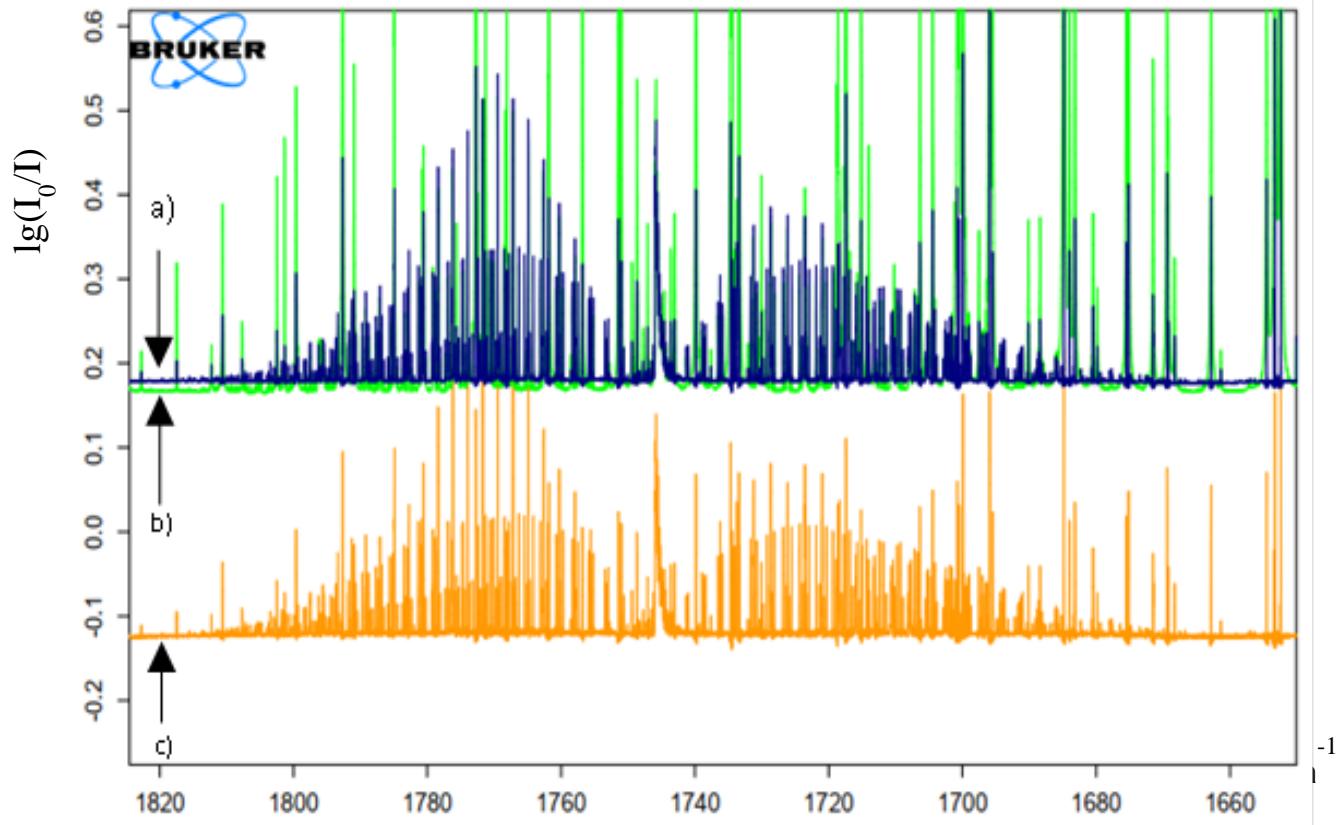 Fig. 2. shows $v(C - H)$ stretching region of the $\mathsf{H}_2\mathsf{CO}\dots \mathsf{HF}$ complex and $\mathsf{H}_2\mathsf{CO}$ molecule. In the spectrum, R, Q, and P branches have observed, respectively. The yellow spectrum (c) belongs to the pure $\mathsf{H}_2\mathsf{CO}$ molecule at pressure $p = 0.006~\mathrm{kgf/cm^2}$, and green (b) belongs to the complex which is recorded at $p = 90$ Torr and at blue (a) belongs to the complex $p = 65$ Torr, respectively. All spectra were recorded at the $0.05~\mathrm{cm^{-1}}$ spectral resolution.
