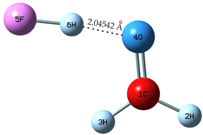 <table><tr><td>Distances, (Å)</td><td>Monomers</td><td>Complex</td><td>Angles, (°)</td><td>Monomer</td><td>Complex</td></tr><tr><td>r(H3–F)</td><td>0.915</td><td>0.936</td><td>∠OCH1</td><td>121.5</td><td>121.3</td></tr><tr><td>r(C=O)</td><td>1.207</td><td>1.215</td><td>∠OCH2</td><td>121.5</td><td>121.1</td></tr><tr><td>r(C–H1)</td><td>1.101</td><td>1.096</td><td>∠OH3F</td><td></td><td>166.4</td></tr><tr><td>r(C–H2)</td><td>1.102</td><td>1.097</td><td>∠COH3</td><td></td><td>111.2</td></tr><tr><td>r(O...H3)</td><td></td><td>1.753</td><td>∠COF</td><td></td><td>141.4</td></tr><tr><td>r(O...F)</td><td></td><td>2.649</td><td></td><td></td><td></td></tr></table>
