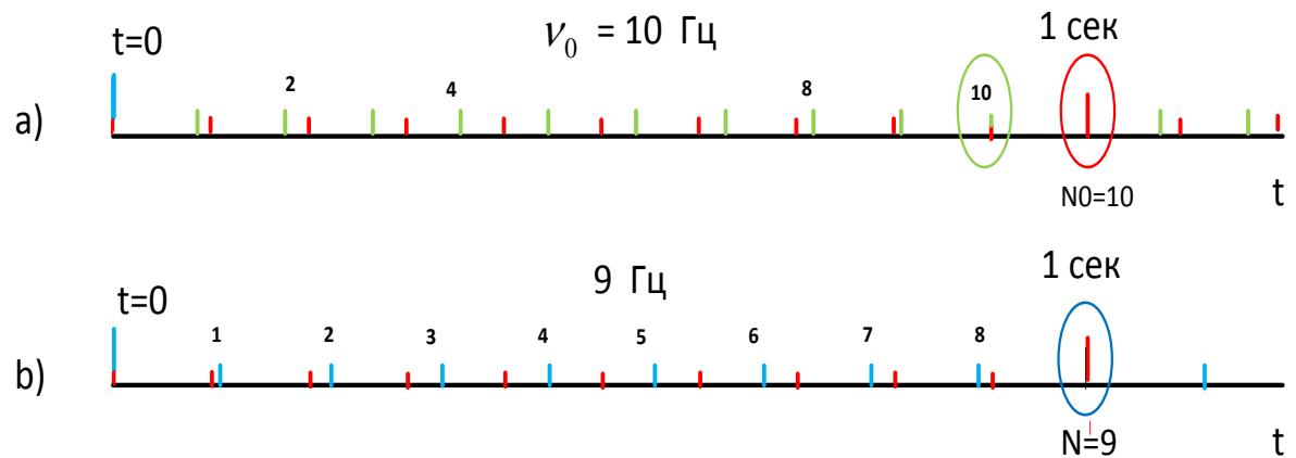 But, as shown above, in order for the clock - with a changed frequency - to run at the same speed after being put into orbit as before the launch, i.e. to remain synchronous with the control center clock, in addition to changing the frequency, the counter setting must also be changed. But due to the relativistic "acceleration of time" in orbit, the setting cannot change in any way and remains the same as the engineers set before the launch (as in Fig. 2, b, $N = 9$ ).