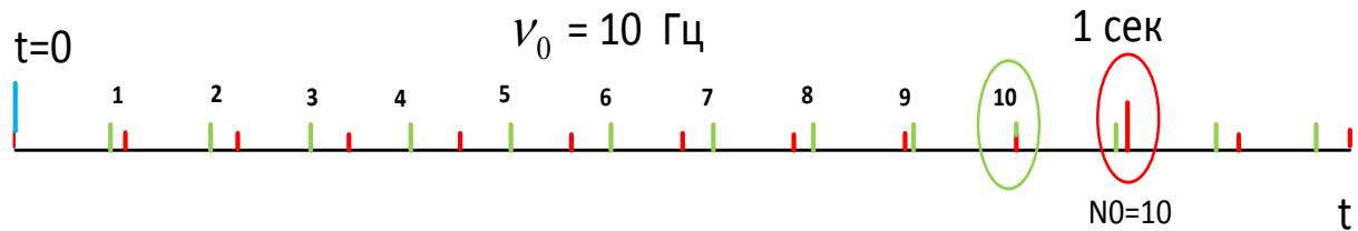 If you change (for example, decrease) only the period (pulses are marked with numbers 1,2,3...), but leave the counter set to the $N = 10$, the pulses will go more often and every tenth pulse will change the time reading earlier, that is, the clock will go faster (Fig. 1).