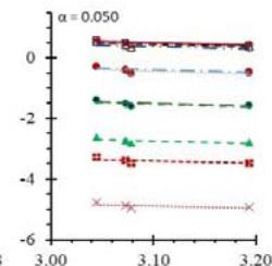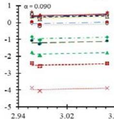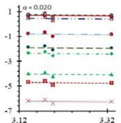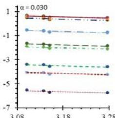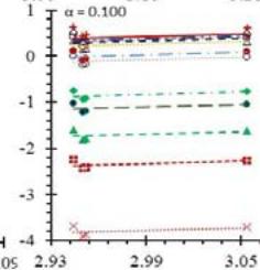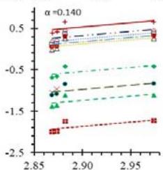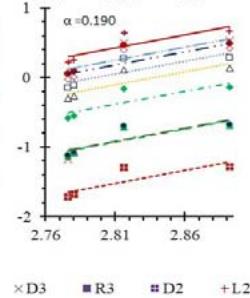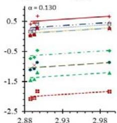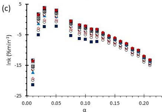 Figure 6 (a) represents the energy barrier values obtained by applying the isoconversional method for each $\alpha$ value (Ea, $\alpha$ ) using the reaction models enlisted in Table 1, where the values of $\alpha$ ranged from 0.010 to 0.210. The corresponding InA values are shown in Fig. 6(c); the corresponding r2 values are shown in Fig. 7. For a given value of $\alpha$, the estimated values of Ea, $\alpha$ obtained from the slopes of the adjusted lines were found to be closed to each other, independent of the f( $\alpha$ ) function, as expected. For instance, the average values of the Ea, $\alpha$ obtained from the slopes of all models for $\alpha = 0.075$ was Ea, $0.075 = -2.88 \pm 0.01$ kJmol-1 with the corresponding InA $\alpha = 1.70 \pm 1.48$ and for $\alpha = 0.120$, the Ea, $0.120 = -10.70 \pm 0.01$ kJmol-1, with the corresponding InA $\alpha = -4.22 \pm 1.19$. However, the variations of the values of InA $\alpha$ depended on the f( $\alpha$ ) function, as expected.