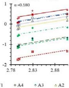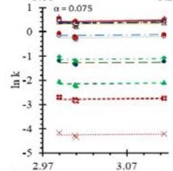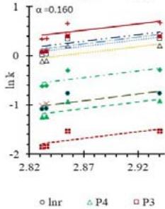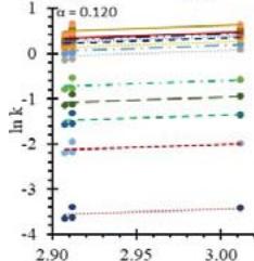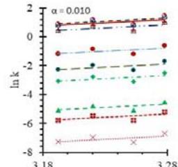 The values of $E_{a}$, and $\ln A$, with the pre-assumed form of $f(\alpha)$, are estimated from the slope and intercept of the Arrhenius plot based on eq. 3, (In [Rate/f(α)] = In k versus 1/T) as shown in Figs. 5, for each given $\alpha$ values, respectively.