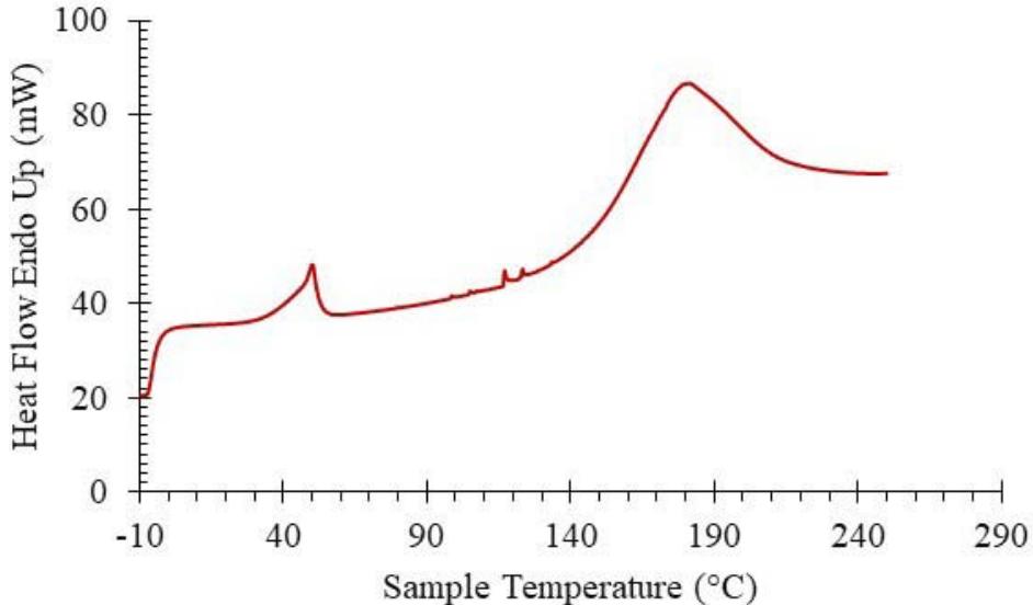 The physical properties such as melting point (mp) and glass transition temperature (Tg) are significant properties of solid materials since they determine their industrial application and the types of processing. Polyacrylamide (PAA) has a relatively high melting point ( $>300^{\circ}\mathrm{C}$ ) and glass transition temperature ( $\sim 163^{\circ}\mathrm{C}$ ) due to strong polar interactions between its amide groups. During the first DSC scan of the DHG (Fig. 3) physical changes at temperatures $\sim$ $50$. $^\circ \mathrm{C}$ ( $\Delta \mathrm{H} \sim 22.7 \, \mathrm{Jg}-1$ ), and $179$. $^\circ \mathrm{C}$ ( $\Delta \mathrm{H} \sim 371 \, \mathrm{Jg}-1$ ) were observed. These transitions are not related to PAA's melting point or glass transition temperature, nor are they related to the melting point of acrylamide (84.5 $^\circ \mathrm{C}$ ). We can, therefore, conclude that they are related to the new product, DHG, as expected.