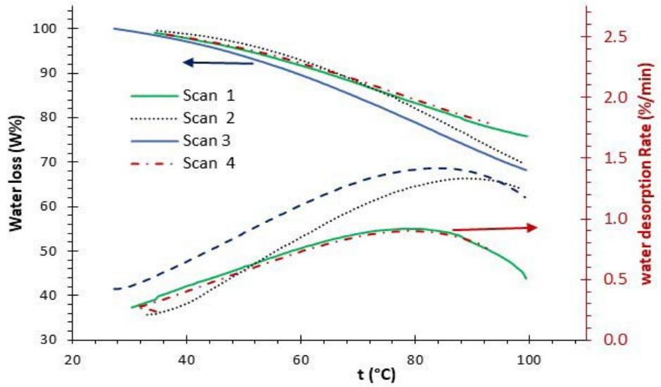 A TGA pan was loaded with $32\mathrm{mg}$ of dry hydrogel for water desorption analysis. The sample was left at room condition for three days to absorb humidity, and then subjected to TGA testing. The water desorption was initiated as soon as the sample was placed into the TGA pan $(27 - 30^{\circ}C)$, as shown by the TGA thermograms in Fig. 4. The 3rd and 4th scans were made after the sample was regenerated for a few days in the lab. The