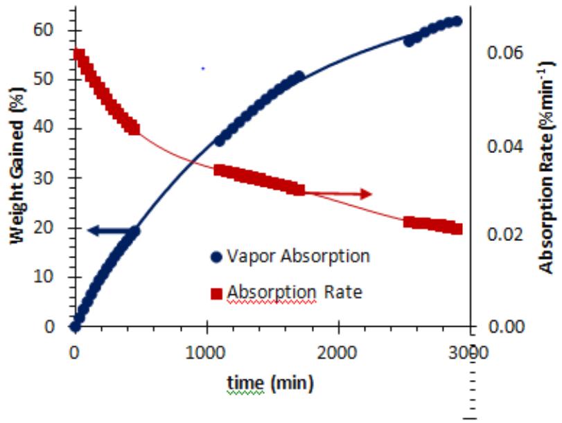 The environmental vapor sorption test was conducted on a Mettler-Toledo Balance at the laboratory conditions of $28^{\circ}\mathrm{C}$, $57\%$ RH during July 2022, in Hodge Hall Lab 314. About $1\mathrm{g}$ of the previously generated DHG was placed on the scale to monitor its water absorption capacity through weight measurement over three days, as shown in Fig. 1. As time progressed, the weight of the DHG increased, indicating that water was being absorbed into the hydrogel from the environment. The DHG absorbed water over $20\%$ of its weight water in, during 7.5 hours (hs), $50\%$ of its weight after 28hs, and over $60\%$ of its original weight when exposed to the lab environment for 50 hours. The rate of moisture absorption by the hydrogel decreased over time. The initial moisture absorption rate was $0.042\%$ /h; it became slower on the second day $(0.022\%$ /h), and much slower on the third day $(0.012\%/\min)$ of the environmental exposure.