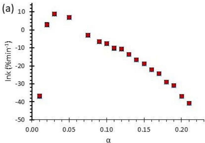 The approach to evaluating independently $\mathsf{A}\alpha$ and f (a) in a model-free method was explained in detail by other authors. [62-64] These studies emphasized correlations between the reaction rate, activation energy, pre-exponential factors, and changes in the rate-limiting steps of the individual steps of a chemical reaction. Since the rate of reaction $(\mathsf{R}\alpha)$ at a given $\alpha$ value is expressed as the product of two terms, $[\mathsf{A}\alpha \mathsf{f}(\alpha)]$ and $[\exp (-\mathsf{E}\alpha / \mathsf{RT})]$, therefore, as the value of $\mathsf{R}\alpha$ decreases and one of the two terms increases the other decreases. When the term, $\mathsf{E}\alpha$, becomes dominant, it is a sign of a change in the limiting step of the reaction.