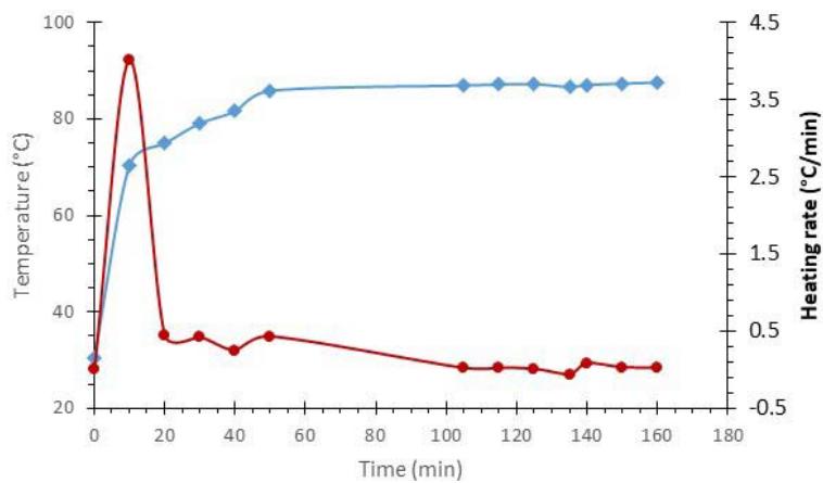 The upper section of Fig. 4 shows the water desorption thermograms and the lower section shows the dehydration rates. In all scans, the water desorption was initiated slowly; its rate increased progressively as temperature increased, and reached maximum around $79^{\circ} \mathrm{C}$, a temperature below the boiling point of water $(100^{\circ} \mathrm{C})$. Our results are consistent with previous studies, which have also reported the release of water from DHG below the water's boiling point. [29]