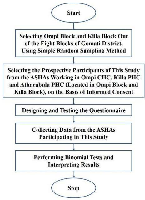 It is a cross-sectional study, conducted between April 2017 and July 2017, on 232 ASHAs working in Ompi CHC (Community Health Centre), Killa PHC (Primary Health Centre) and Atharabula PHC. These centres (i.e., two PHCs and one CHC) are located in Ompi RD (Rural Development) Block and Killa RD Block; these two blocks have been selected by the simple random sampling method from the eight RD blocks of the Gomati District of Tripura.