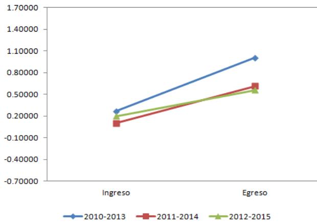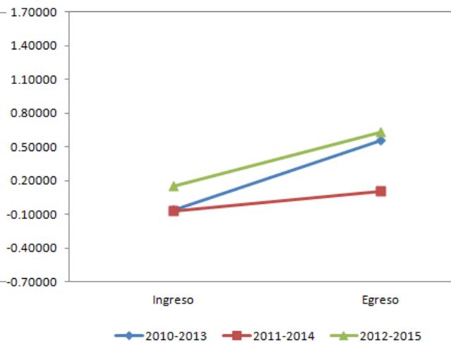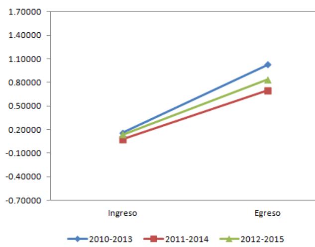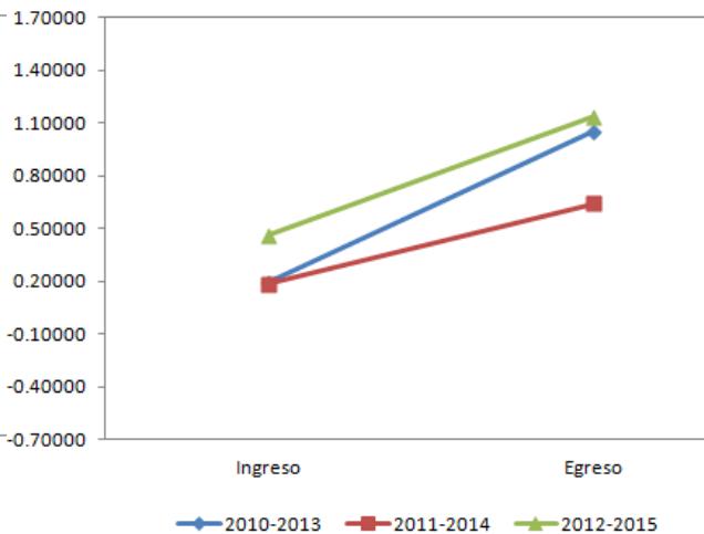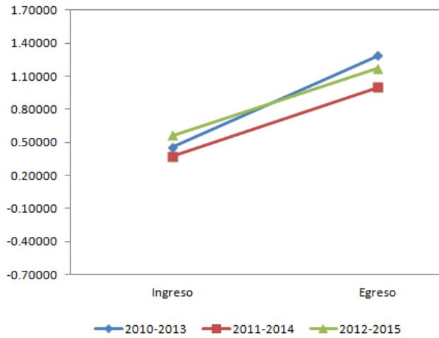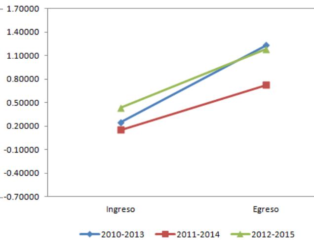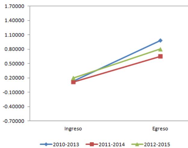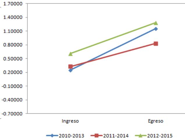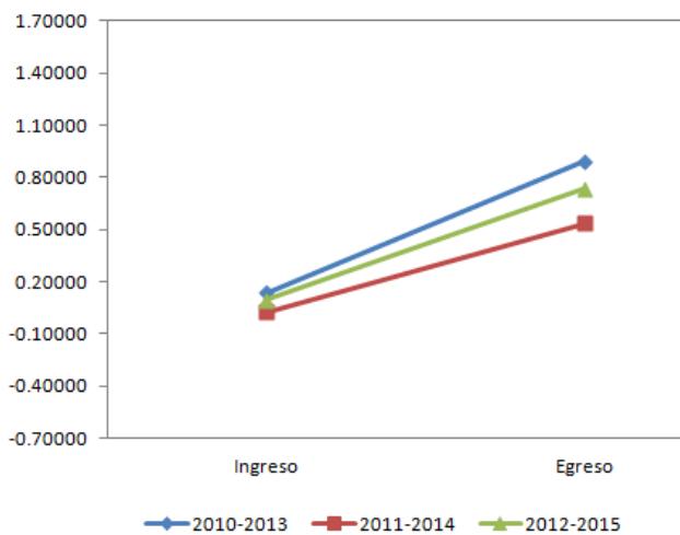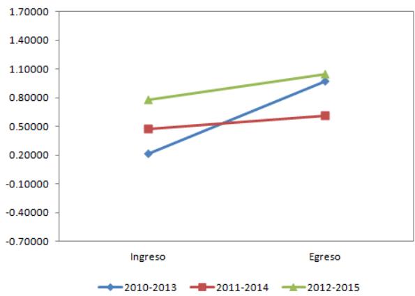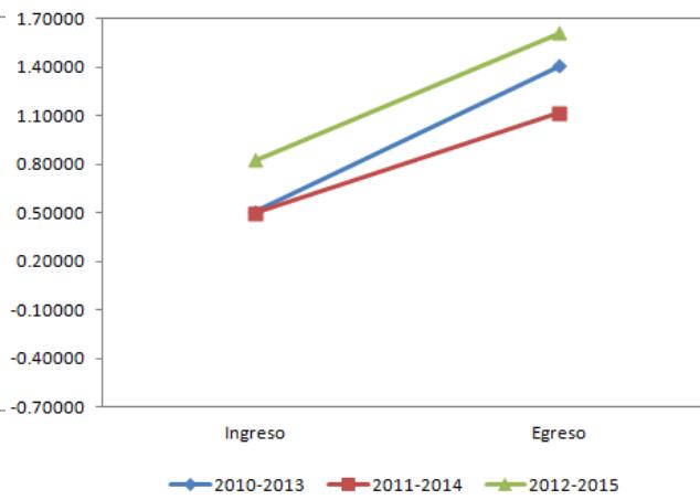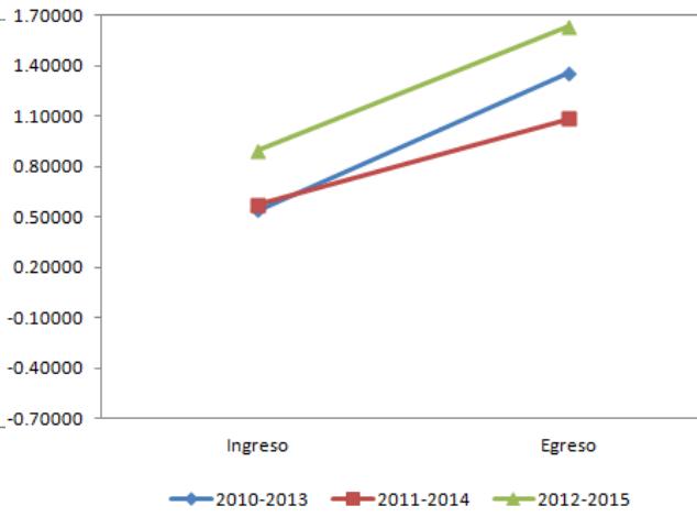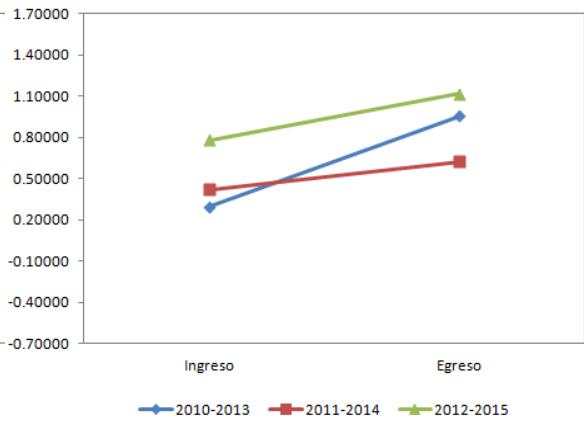 Al comparar gráficamente las medias a nivel nacional, se observa que en el área de Comunicación (figura 1), los alumnos de las tres generaciones tenían, al momento de ingresar a la educación media superior, un nivel de habilidad similar. Sin embargo, se aprecian diferencias en la distancia entre las medias de habilidad al egresar del tramo educativo, siendo más pronunciada la de la generación 2010-2013. En el área de Matemáticas (figura 2), los alumnos de las generaciones 2010-2013 y 2011-2014 obtienen una media de habilidad al ingreso muy similar y se separan al egreso, siendo mayor la distancia entre los puntos al final para la generación 2010-2013. Las medias de habilidad de la generación 2012-2015 se encuentra por encima de las otras dos cohortes en ambos momentos de evaluación.
