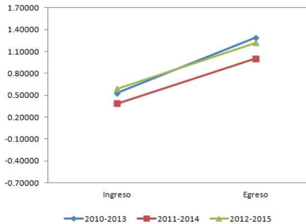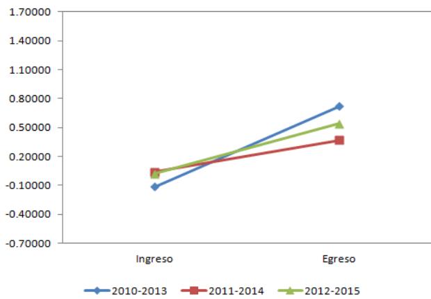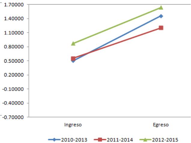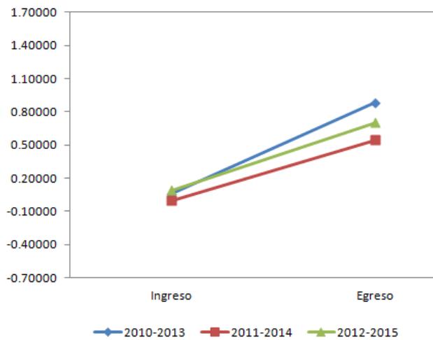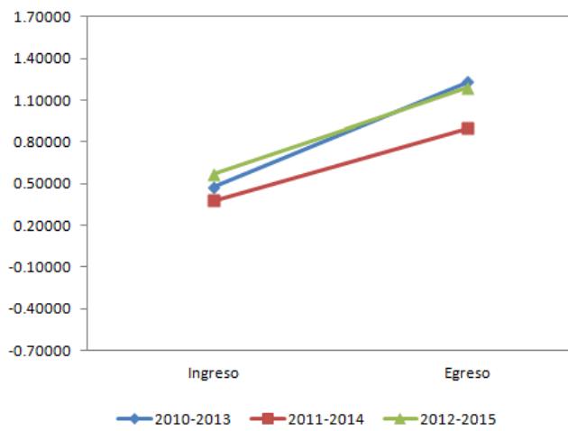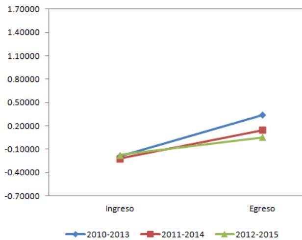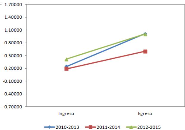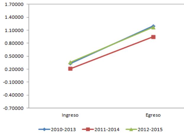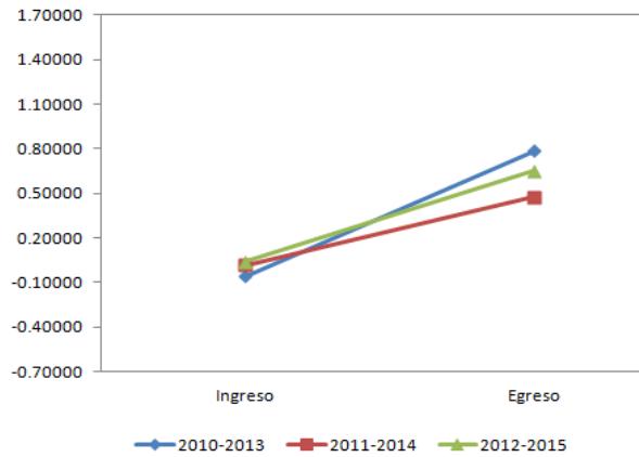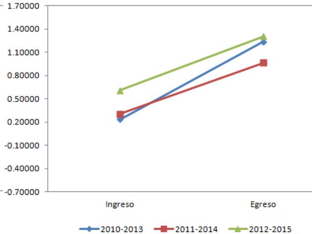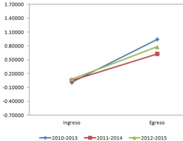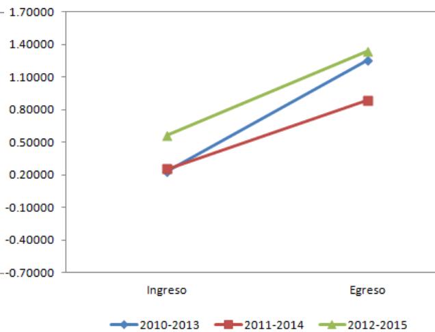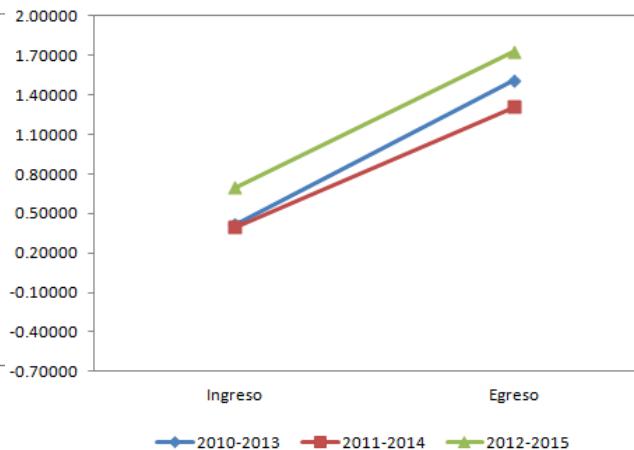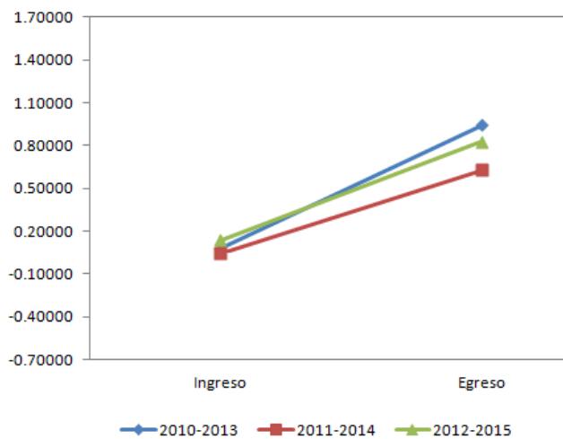 Al comparar gráficamente las medias a nivel nacional, se observa que en el área de Comunicación (figura 1), los alumnos de las tres generaciones tenían, al momento de ingresar a la educación media superior, un nivel de habilidad similar. Sin embargo, se aprecian diferencias en la distancia entre las medias de habilidad al egresar del tramo educativo, siendo más pronunciada la de la generación 2010-2013. En el área de Matemáticas (figura 2), los alumnos de las generaciones 2010-2013 y 2011-2014 obtienen una media de habilidad al ingreso muy similar y se separan al egreso, siendo mayor la distancia entre los puntos al final para la generación 2010-2013. Las medias de habilidad de la generación 2012-2015 se encuentra por encima de las otras dos cohortes en ambos momentos de evaluación.