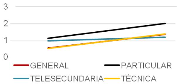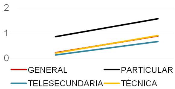 Otro aspecto analizado en este estudio de ganancia educativa es el relativo al tipo de secundaria en la que estudiaron los alumnos. Se consideran cuatro tipos de secundarias: general pública, técnica pública, telesecundaria y secundarias particulares.
