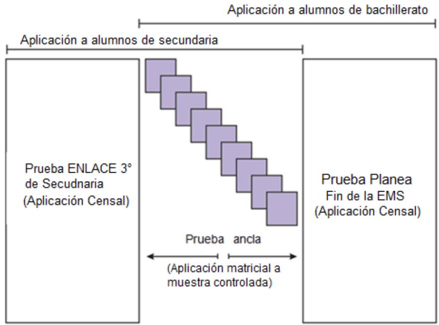 Para realizar el estudio de ganancia educativa, se buscó que las pruebas ENLACE de secundaria y ENLACE/PLANEA MS midieran constructos semejantes. Se optó por tomar como medida de ingreso los resultados de ENLACE de tercero de secundaria y para la medida de egreso los correspondientes a ENLACE/PLANEA MS. Con el fin de establecer una escala común entre estos instrumentos, el proceso se apoyó con el diseño de pruebas ancla que primero, como parte de ejercicios previos, y después como instrumento consolidado se aplicaron de forma controlada y se distribuyeron de manera matricial a una muestra representativa de estudiantes, tanto de tercero de secundaria como del último ciclo de bachillerato (esquema 1).