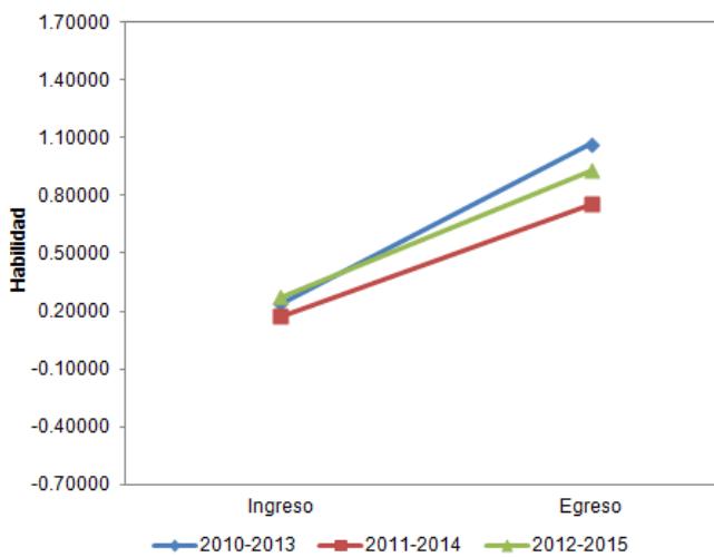 En las gráficas se registran diferencias en la distancia entre las medias de habilidad al egresar del trayecto educativo, siendo ligeramente la más pronunciada la de la generación 2010-2013. Asimismo, las medias de habilidad en Comunicación de la generación 2011-2014, tanto al ingreso como al egreso, se ubicaron por debajo de las otras dos generaciones.12
