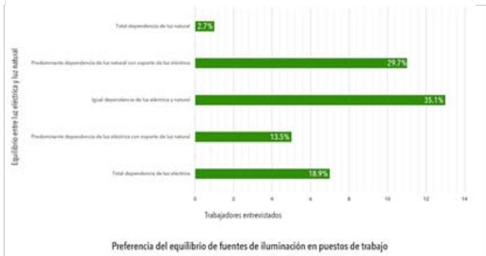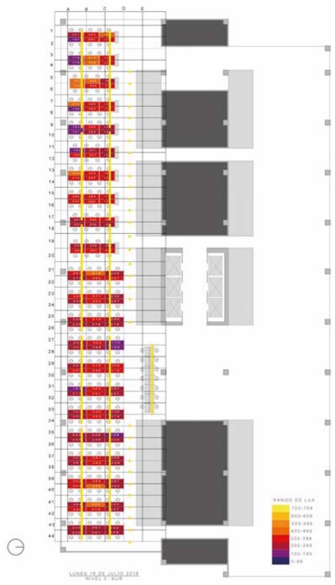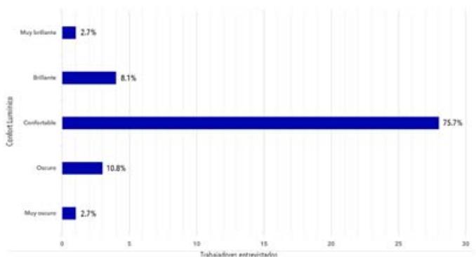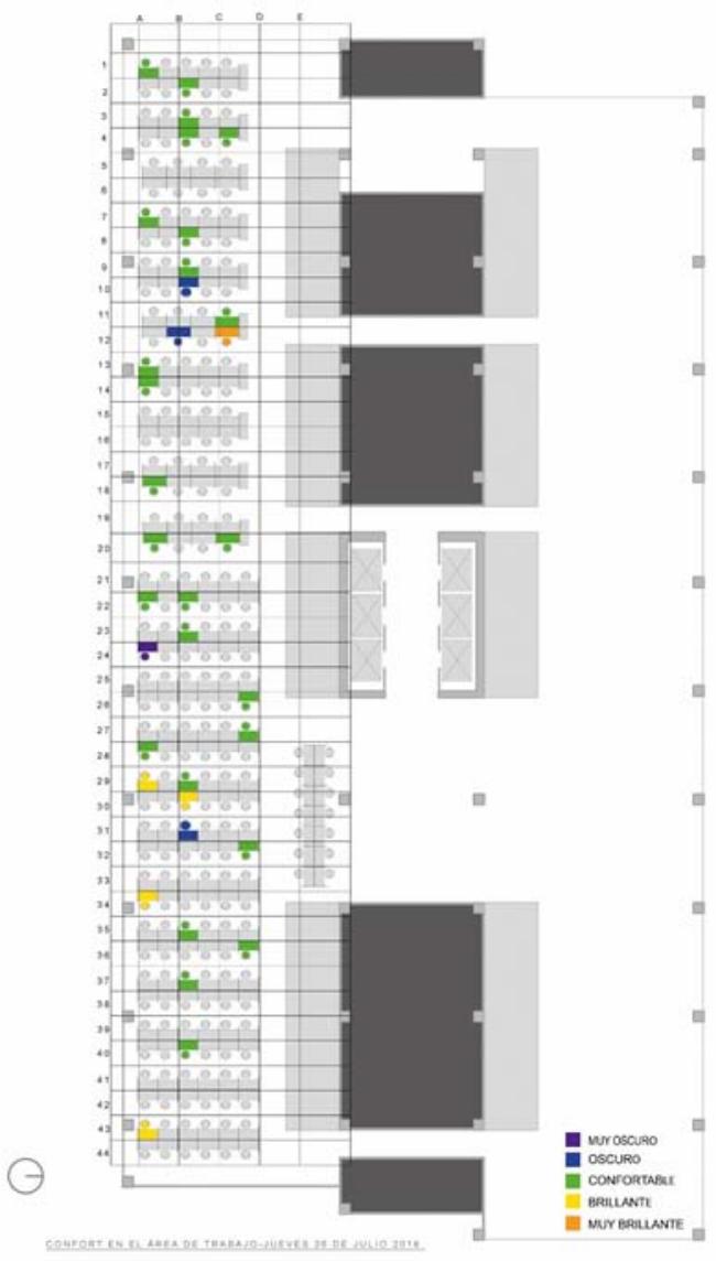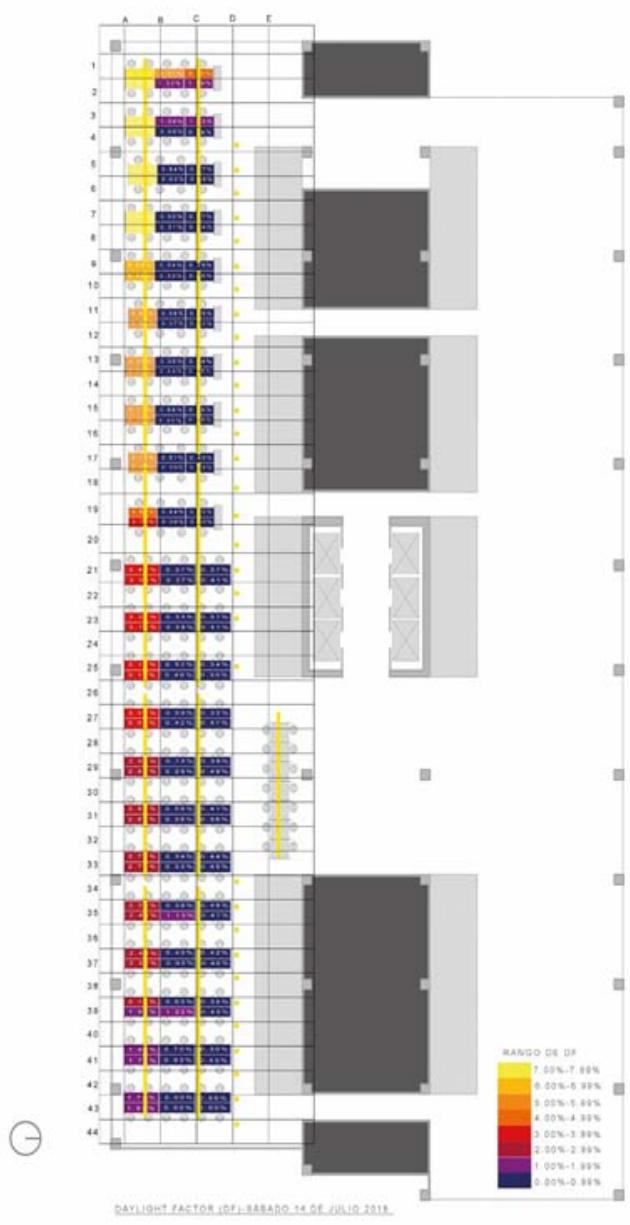 Illumination represents one of the main factors that affect energy consumption on a building, this consumption is even more on an office building. This study presents quantitative and qualitative data of the south façade of an open-plan office in Panama of a building that has a system to regulate internal light. To accomplish this, several measurements of illuminance in three different sceneries: evaluating daylight factor, measuring illuminance levels (lx) and luminance levels with users’ perception. It was concluded that the building requires this system of light control to operate correctly, 75% of the participants describe their workplace as comfortable.