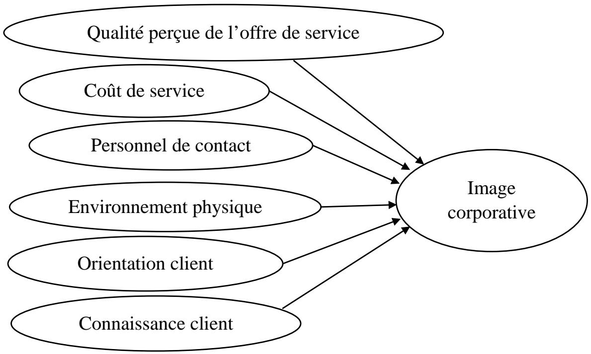L'image corporative influence la qualité perçue de l'offre de service. Très peu d'études étudient cette relation dans le cadre des services. Par ailleurs, les études réalisées dans le cadre des services présentent des résultats mitigés. D'une part l'image corporative a une faible influence ou quasi inexistante sur la perception de la qualité de service (Stafford et Enis 1969). Cependant, Nguyen (1991) confirme que la perception de l'image corporative a un effet favorable et significatif sur la perception de la qualité de l'offre de service chez le client. Toutefois, les résultats obtenus de son étude empirique se sont révélés discutables. D'autre part, dans une recherche relative aux services bancaires, Nguyen et Leblanc, (1995) pensent que c'est plutôt la qualité perçue de l'offre de service qui influence l'image corporative, bien que cette influence soit statistiquement faible.