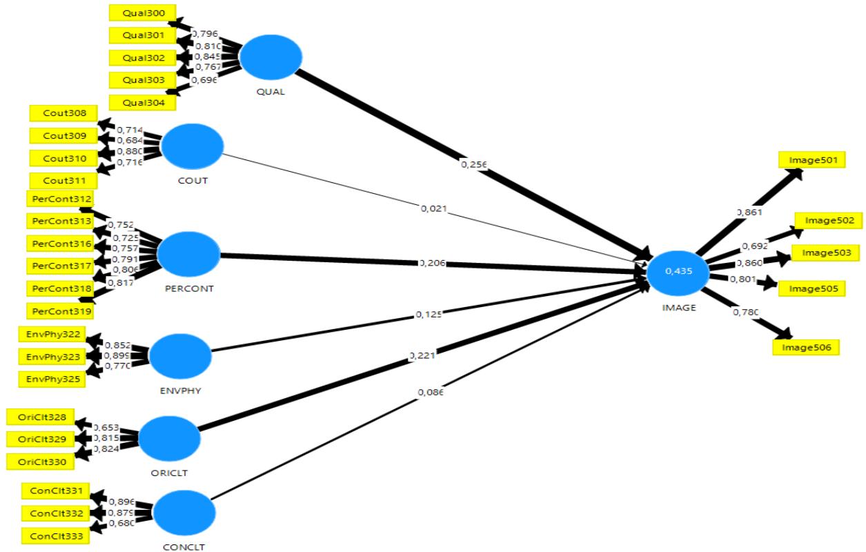 <table><tr><td></td><td>Coefficients des chemins</td><td>Valeur t (| O/STDEV |)</td><td>niveau de signification</td><td>valeurs-p</td></tr><tr><td>CONCLT -> IMAGE</td><td>0,086</td><td>3,215</td><td>*</td><td>0,001</td></tr><tr><td>coût -> IMAGE</td><td>0,021</td><td>0,749</td><td>NS</td><td>0,454</td></tr><tr><td>ENVPHY -> IMAGE</td><td>0,125</td><td>3,154</td><td>*</td><td>0,002</td></tr><tr><td>ORICLTI -> IMAGE</td><td>0,221</td><td>6,752</td><td>*</td><td>0</td></tr><tr><td>PERCONT -> IMAGE</td><td>0,206</td><td>4,927</td><td>*</td><td>0</td></tr><tr><td>QUAL -> IMAGE</td><td>0,256</td><td>6,305</td><td>*</td><td>0</td></tr></table>