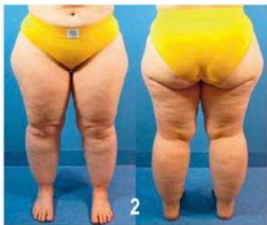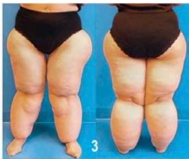 Lipedema has, in general, a heterogeneous and variable progression, as some individuals may have a stabilization of the disease over time, while others may have a gradual progression. Considering the evolution of lipedema, the most common complaints are orthostatic edema, pain with digital pressure on the affected limbs, hematomas, fatigue and discomfort in the legs. In addition, excess fat in the buttocks, hips, thighs and legs interfere with gait and the misalignment of the mechanical axis of the leg, promoting joint stress that can progress to valgus osteoarthritis of the knee, antalgic gait and/or excessive pronation of the knees. feet. Considering that obesity is a risk factor for lipedema and that women with this disease are at increased risk of developing morbid obesity, it is thought that these patients would have a severe cardiovascular profile. However, according to BUSO et al, fat with gynoid distribution of lipedema correlated negatively with insulin resistance after adjustment for total fat and, consequently, with a less severe cardiovascular profile. This conclusion of cardiovascular risk for patients with lipedema has not been well elucidated. $^{1}$ Thus, more concrete studies are needed to clarify more clearly the pathophysiology and complications generated by lipedema.