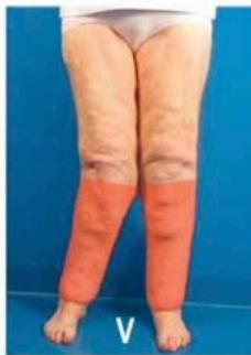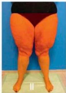 - Stage III: Deforming fat deposits, macronodular changes, potentially Stemmer sign positive lymphedema, sensitive subcutaneous nodules, a relevant increase of loose skin/tissue circumference, protruding fat mainly on the inner thighs and knees.