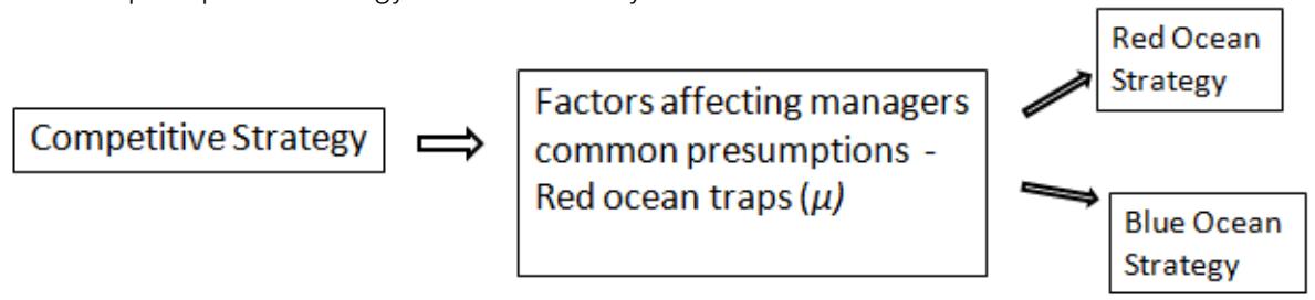 Note: $\mu$ stands for moderator it shows that red ocean traps act as a moderator in determining the category of a competitive strategy as red ocean or blue ocean.