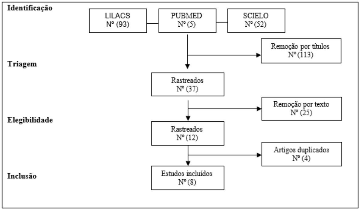 A "Scielo" identificou 52 estudos, seguindo 15 de triagem, 7 de elegibilidade e 5 incluídos. A "Lilacs" identificou 93 estudos, seguindo 22 de triagem, 5 de elegibilidade e 3 incluídos. A "Pubmed" identificou 5 estudos, seguindo O triagem, O de elegibilidade e 0 incluído. A representação destes dados está exposta na "Figura 1", no fluxograma do processo de seleção dos estudos, adaptado ao "Preferred Reporting Items for Systematic Reviews and Meta-Analyses" (PRISMA) (Jbi, 2014).