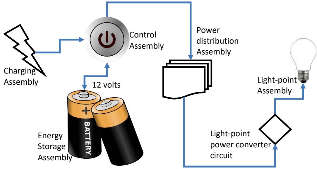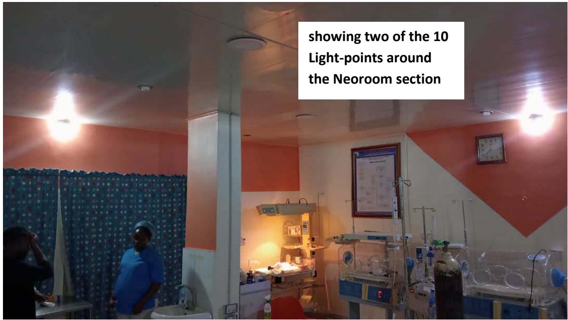 The set objectives of the project were defined to include but are not limited to: (a) to make the new system an independent installation from any existing powerbank backup system that supplies the sockets for powering the incubators and other essential equipment in the Unit. (b) the system should be operated on low dc power with artificial intelligence to know when there is sufficient daylight or conventional electric power to enable its automatic switching (ON/OFF) as necessary. (c) the system's total power storage should be sufficient to support all light-points throughout the dark periods of the night and cloudy day. (c) the system should sufficiently rely on solar panels for the recharging of its batteries so that it could be reliable as the only source of lighting a facility in a typical remote village of Nigeria without grid electricity.(d) the light-points should be as maintenance free as possible with high reliability and great illumination intensity. (e) the illumination intensity of each light-point should be powerful enough to enable a staff team to carry out neonatal 'line-setting' procedure at night-time without the need for extra lighting support. (f) the battery storage requirement should be easily sourced locally within the nearest urban town market to avoid prolonged downtime when a replacement is needed.