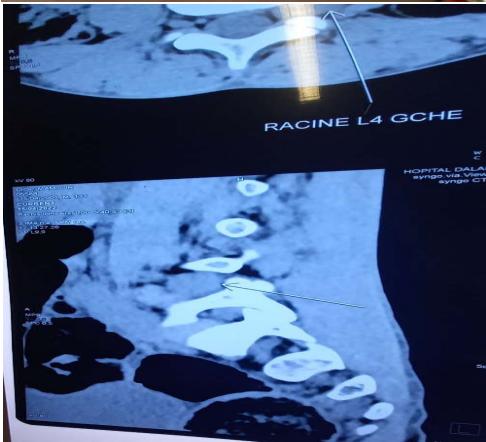 The scanner revealed hypertrophy of the left L4 root of $12.8 \, \text{mm}$ in probable conflict with the disc