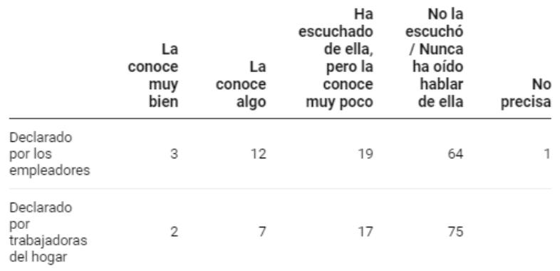 During 2021, Law 31047 was published with the purpose of regulating the labour relations of household workers. This law establishes the obligation to have a written contract registered with the Ministry of Labour and Employment Promotion, as well as a workday of no more than 8 hours per day and 48 hours per week, and a salary of no less than S/ 930 soles -an equivalent of 253.03 US dollars-. It also establishes that this work can only be performed by adults. In addition, the law decrees that domestic workers are entitled to two annual bonuses, each equal to one month's salary. Additionally, it establishes paid vacations of thirty days and other benefits such as severance pay and maternity leave (Alva, 2023). Unfortunately, knowledge of the new law has not spread as expected. In fact, "Nine out of 10 domestic workers know little or do not know the new law, while eight out of 10 employers are in the same situation" (Alva, 2023).