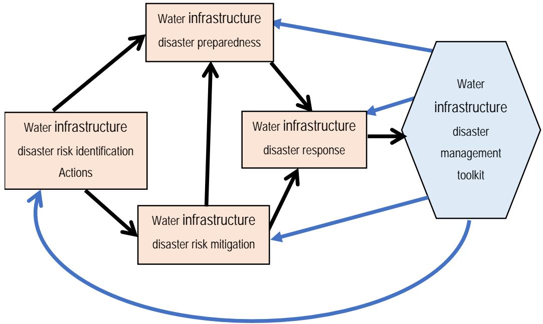 Thus, insinuating that when one part fails, the system is brought into entropy, meaning the system collapses. From Figure 3.1, it is hypothesised that (i) Water infrastructure disaster risk identification; (ii) Water infrastructure disaster risk mitigation; (iii) Water infrastructure disaster preparedness; and (iv) water infrastructure disaster response activities must work in harmony for the management system (framework) to effectively function. Therefore, keen and constant attention must be given to each stage for the disaster management framework to be effective. Similarly, the full participation of all the primary stakeholders is essential for the framework to work effectively.