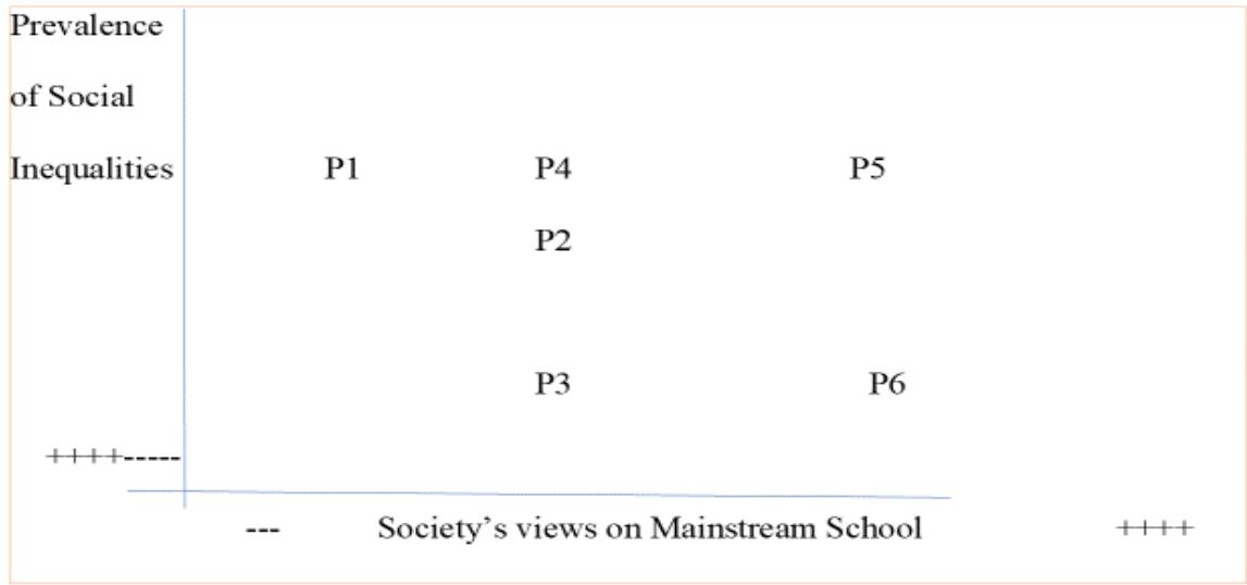 <table><tr><td rowspan="2">Importance of Segregation</td><td>P1</td><td>P5</td><td></td></tr><tr><td>P4</td><td></td><td></td></tr><tr><td rowspan="2">++++</td><td>P2</td><td>P3</td><td>P6</td></tr><tr><td colspan="2">--- Collective Views in School and community</td><td>++++</td></tr></table>