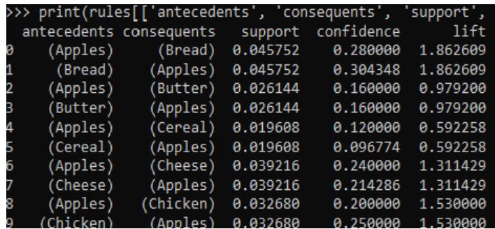 - Confidence: Confidence quantifies the likelihood of the consequent item being purchased when the antecedent item is already in the basket. Alternately it shows the probability of buying the subsequent item wherein the antecedent item is already in the basket. Figure above shows that there is a $30.43\%$ chance of buying Apples when Bread is already kept in the basket after purchase. The probability that a transaction that contains the items on the left hand side of the rule (in our example, pencil and paper) also contains the item on the right hand side (a rubber). The higher the confidence, the greater the likelihood that the item on the right hand side will be purchased or, in other words, the greater the return rate you can expect for a given rule.[^7]