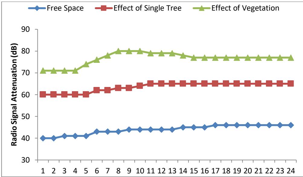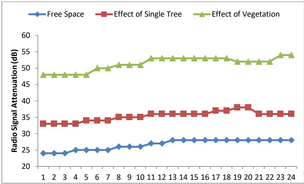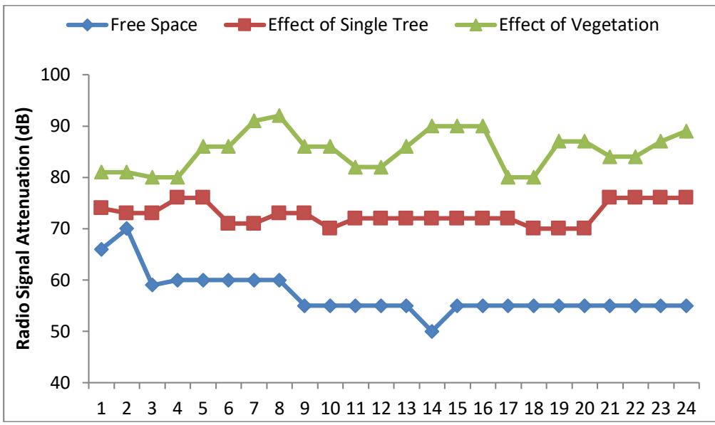 Figure 3: Radio signal attenuation under Free Space Condition, behind a Tree, and inside vegetation at a distance of 20m