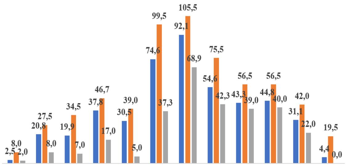 To determine the hydrological regime of the flow in the Narpay Canal, a systematic analysis of 12-year water discharge data from 2010 to 2021 was carried out, and a hydrograph was drawn. One of them is shown in Figure 1. Narpay for 2010-2021 Assessment of flow changes in canals is carried out by determining and assessing the average monthly values of long-term water flow from the water source.