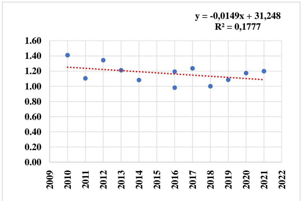 Based on the results of the calculated water volume of the Narpay Canal for 2010-2021 in Table 2, a graph of Figure 2 is drawn. This graph, representing the change in water volume over the years, has a linear functional relationship and obeys the following equation [4, 7].