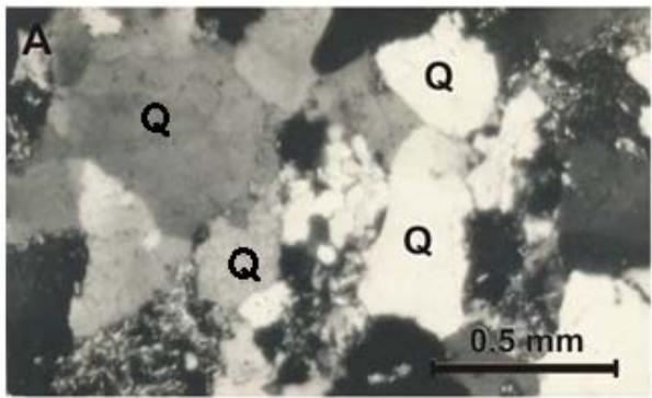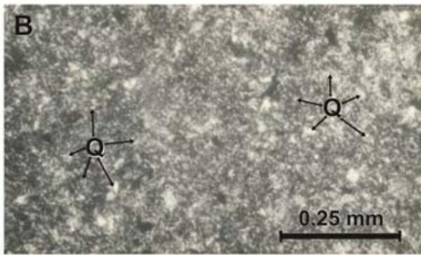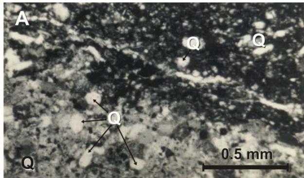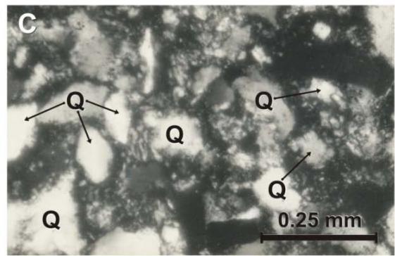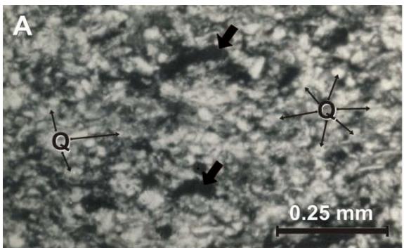 Figure 6: Micro-photographs of the Zorrillo/Taberna "Unit": A) Carbonaceous- phyletic siltstone, at natural light conditions. Clay cement, grains are mainly of quartz (Q) and carbonaceous material is in small forms, pointed out by arrows. B) Quartzite-phylitic mudstone observed by crossed nicol. It is observed mainly clay and clastic grains of quartz and mica (M). C) Subarkosic quartzite phyletic mid-grain sandstone observed by cross nicol. Quartz grains are plentiful