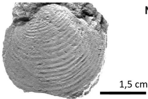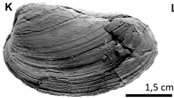 N Figure 14: Specimens collected from the Oatera Formation. I) y J) Eocallista imlayi, K) Pleuromya sp., L) Crenotrapezium hayam. Specimens collected from the Yucunut Formationi. M) Lucina sp., N) Lima (Plagiotoma) sp., N) Gryphaea mexicana