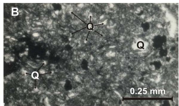2) Quartzite - subarkose siltstone. Rock constitution is $70 - 80\%$ of grains with argillaceous matrix short abundant (20-30% of rock), which give a sub mature texture (Fig. 12B). Grains are constitute by quartz $(70 - 80\%)$, sharp grains with parallel extinction (wavy extinction are rare), size typically is bimodal $(10\mu m$ and $40~\mu m)$. Left grains (20 to $30\%$ ) are constitute by feldspar (?alcaline), crystals are fractured and change, its average size is $40~\mu m$. Matrix consists of clay, mica and calcite micro-crystals. Plutonic origin suggested by quartz type.