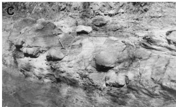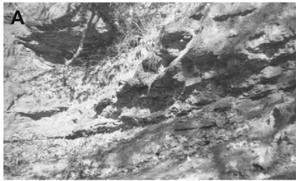 Litology: Main part of the Simón Formation is a middle to gross grain subarkose sandstone, grey to white color, with beds of 0.40 to $1\mathrm{m}$ and to $1.5\mathrm{m}$ when grain size increase, this beds belonged to a group of beds mainly of reddish or bluish siltstone, which thickness is from 10 to $50\mathrm{m}$. There are some red ferruginous nodules. There is mainly diastratification as primary structure (Figs 7A-7B). Description of the common lithology identified is as follow: