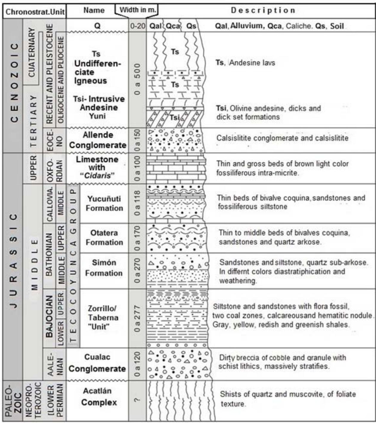 Tecocoyunca Group in the Numí River area, Tlaxiaco region, Oaxaca, consists at its lower part of the Zorrillo/Taberna "Unit" of Lower (late part) Bajocian and Late Bajocian (begin part) age, transitional is overlaying Cualac Conglomerate of Aalenian age, they are $\sim 287$ m thick constituted by carbonaceous siltstone, mudstone, subarkose, very fine grained sandstone and siltstone, hold bivalves and fossil flora, as well as two coal beams, one at the lower part and the other at middle of upper part. The inferred deposit environment of this unit is a delta complex, composed by coastal marsh and fluvial contributions. This units are overlaying by Simón Formation, of Middle-Late Bathonian age, which is constituted by $\sim 270\mathrm{m}$ of thin and gross beds of siltstone and subarkose set; its deposit environment inferred is transitional (beach zone). The Simón Formation is transitionally overlay by Otatera Formation of Late Bathonian age, which consists of pelecypods coquina with interlayers of spathite limestone strata of $\sim 170\mathrm{m}$ thick; the inferred deposit environment of this unit is shallow marine, and some contribution of beach. This unit is concordantly overlay by Yucuñuti Formation of Middle Callovian age, which is constituted by fine grain sandstone, coquina and biomicrita $\sim 118$ m thick, holding bivalves; the inferred deposit environment is transitional (flood plain, coastal marsh and shallow neritic zone); this unit is discordant overlay by Limestone with "Cidais" of Oxfordian age.