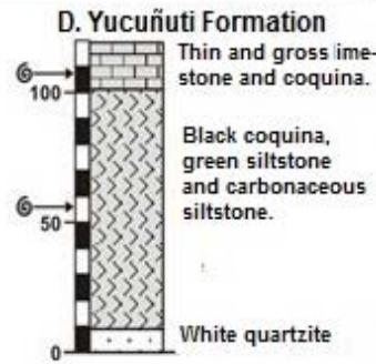 Lithology. The Yucuni Formation is a sequence that starting with fine grains of whitish and rose colors sandstones (Fig. 11); middle part consists of black color ostracods coquina interlayered by light grey siltstone with several burrows. Upper parts consist of middle thick beds (20 to $30~\mathrm{cm}$ ) of fossiliferous limestones interlayered by thin beds of Lucina coquina. Restricted beds of coquina alternate with ostracoda and pelecypod species. Main identified lithology are described as follow: